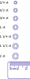 | These sizes shown below are approximate sizes only and are based on common diameters of well-cut diamonds. Actual size will depend on many factors including the depth of the pavilion which is not taken into account here. |